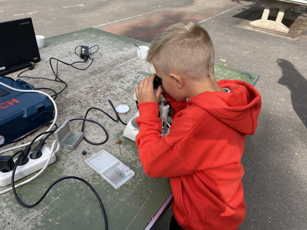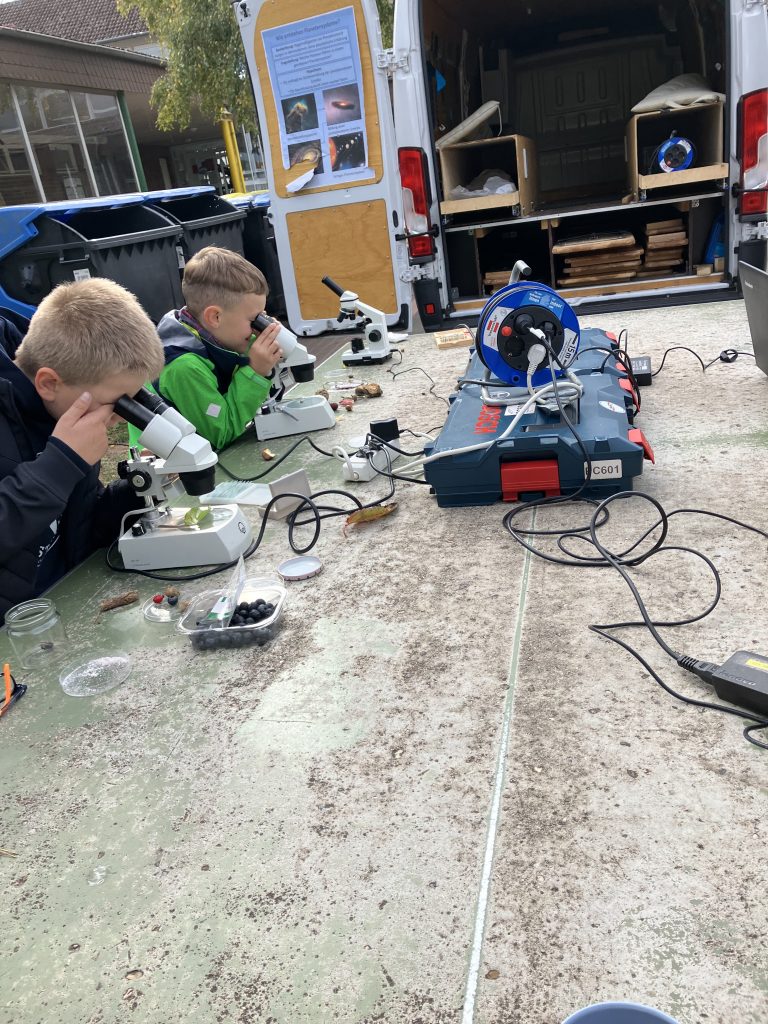 Einen weiteren Schwerpunkt der MINT-Projekttage bildeten die Mikroskop-Arbeiten. Hier konnten Blätter, Pflanzenfasern, Kristalle oder Wassertropfen untersucht werden. Viele Kinder sahen zum ersten Mal die feinen Strukturen, die mit bloßem Auge nicht sichtbar sind.