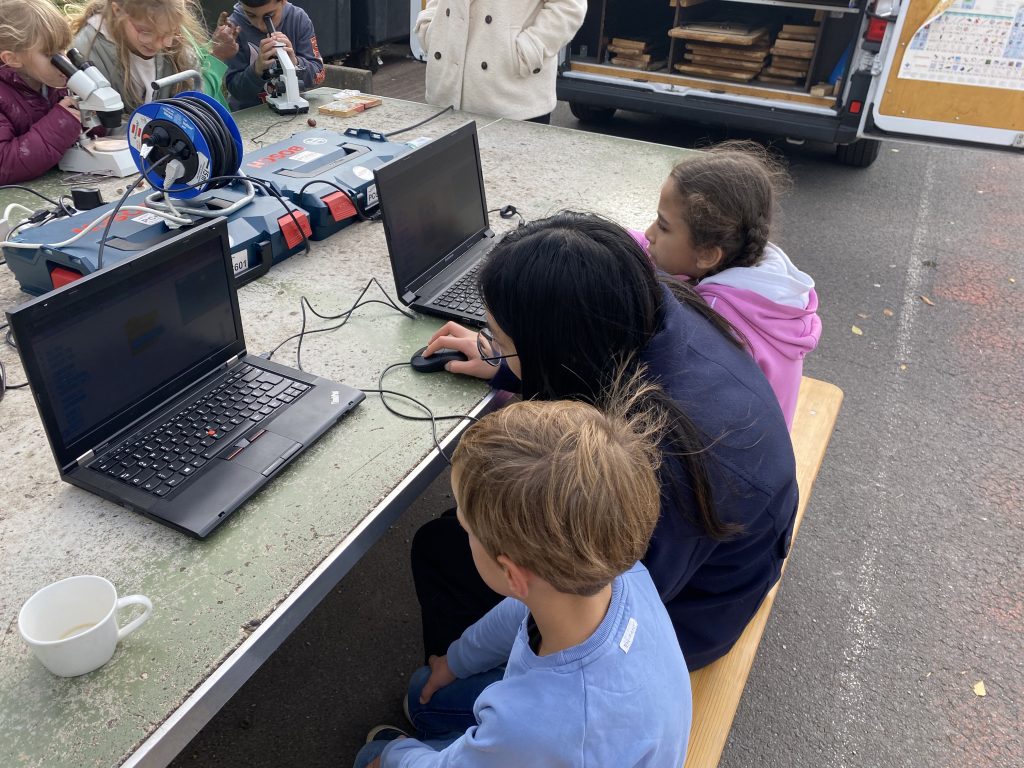 Am Mittwoch und Donnerstag machte der MINT-Van auf unserem Schulhof Station. In kleinen Gruppen hatten die Schülerinnen und Schüler die Gelegenheit, 45 Minuten lang wurde dort die Programmiersprache Scratch vermittelt. Die Kinder lernten spielerisch, wie man mit einfachen Bausteinen Befehle zusammensetzt und damit Figuren oder Abläufe steuern kann.